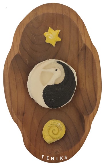 Hieronder viel de sepia (foto links) op de grond. Maar.......als een echte Feniks is hij weer herrezen. De gemaakte figuren waren intact gebleven en via dit gevonden houten ondergrond is dus deze Feniks herrezen.